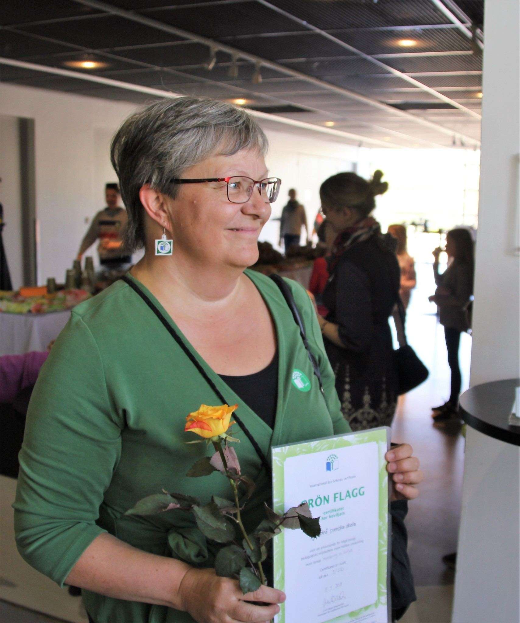 - Sjundeå svenska skolas Lena Alroth med skolans nya certifkat och sina fina Grön Flagg-örhängen!