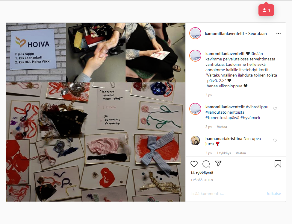 Många andra firade också dagen på fantasifulla och väl avvägda sätt. Om ni glömde bort eller inte hann med dagen just nu kan ni till exempel inspireras av de här exemplen och fira Alla hjärtans dag den 14.2. istället – temat med immateriella gåvor och att göra andra glada passar bra in också då (eller när som helst)!